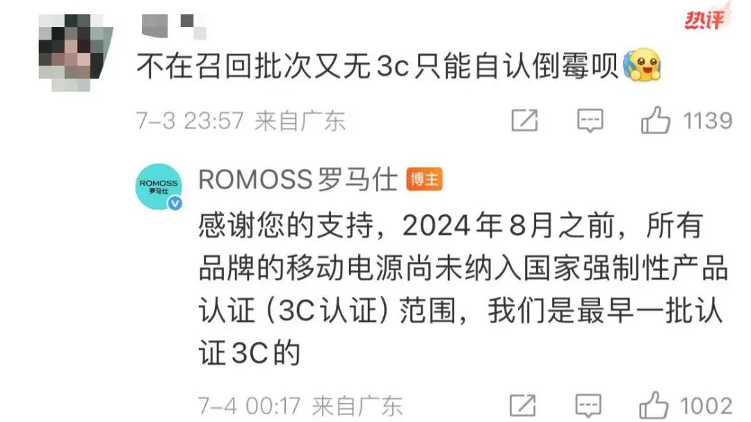 罗马仕回复:“感谢您的支持,2024年8月之前,所有品牌的移动电源尚未纳入国家强制性产品认证(3C认证)范围,我们是最早一批认证3C的。”