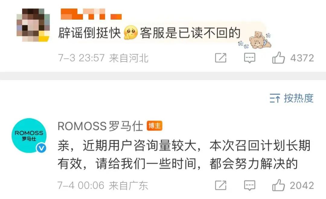 罗马仕回复:“亲,近期用户咨询量较大,本次召回计划长期有效,请给我们一些时间,都会努力解决的。”